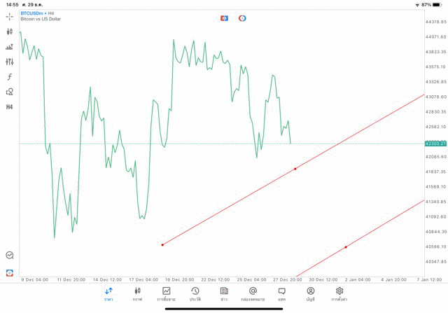การวาด Trendline หรือ Tradeline H4 Crypto BTCUSD application Meta trader 5 หรือ mt5 โบรกเกอร์ forex exness