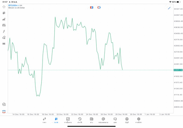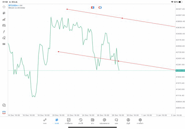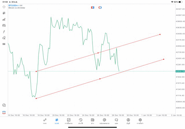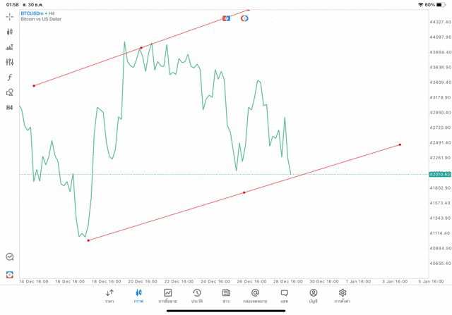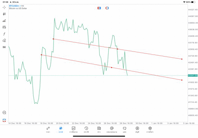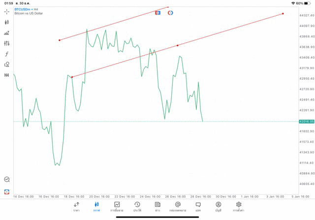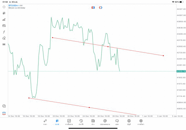 การวาด Trendline หรือ Tradeline H4 Crypto BTCUSD application Meta trader 5 หรือ mt5 โบรกเกอร์ forex exness