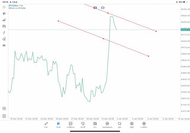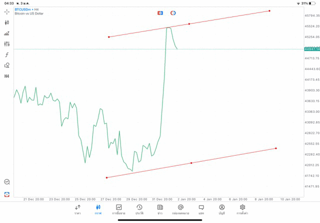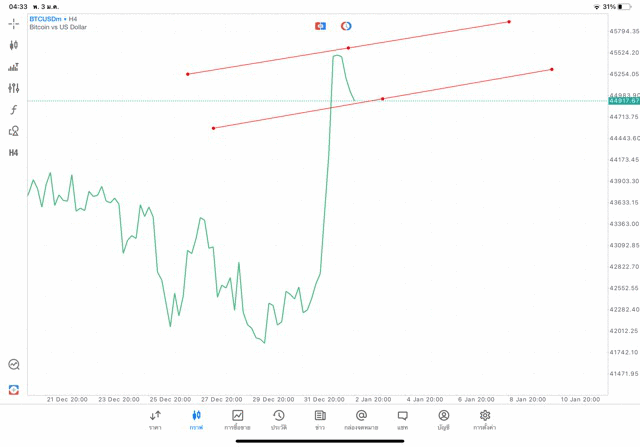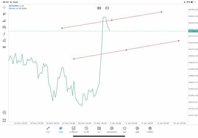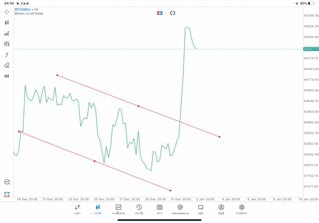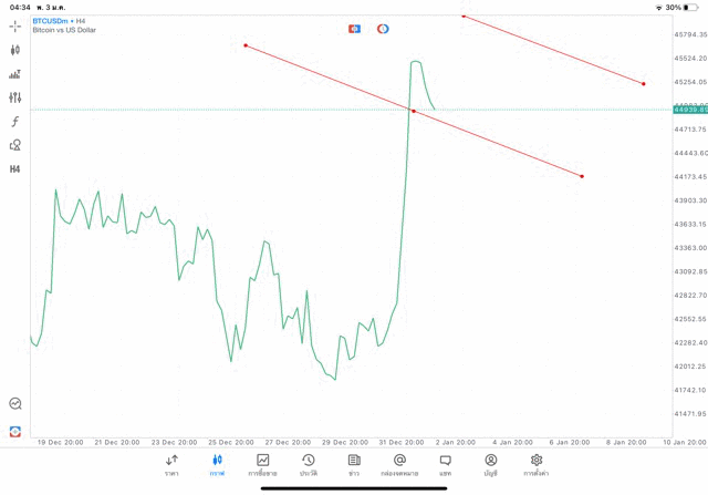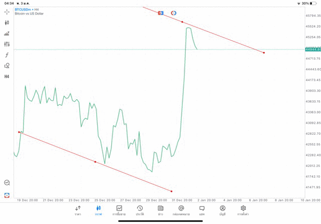 การวาด Trendline หรือ Tradeline H4 Crypto BTCUSD application Meta trader 5 หรือ mt5 โบรกเกอร์ forex exness