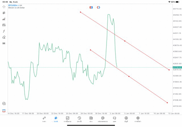 การวาด Trendline หรือ Tradeline H4 Crypto BTCUSD application Meta trader 5 หรือ mt5 โบรกเกอร์ forex exness