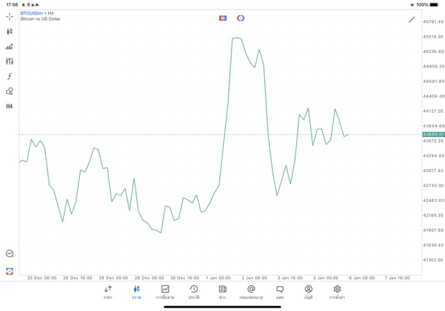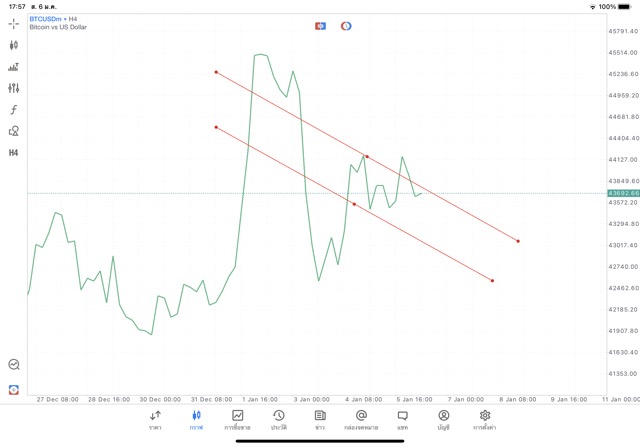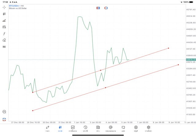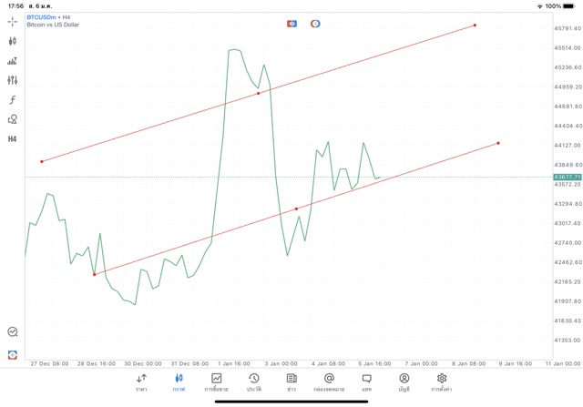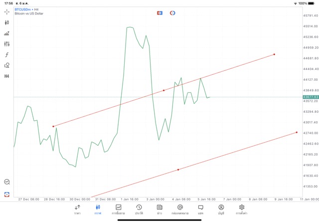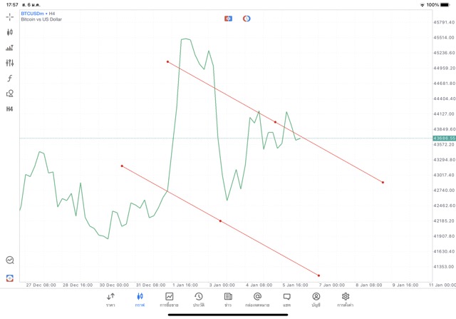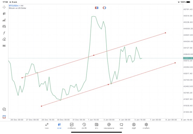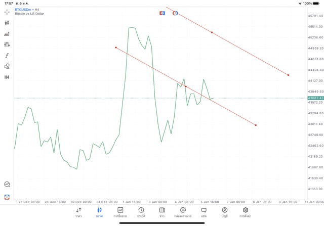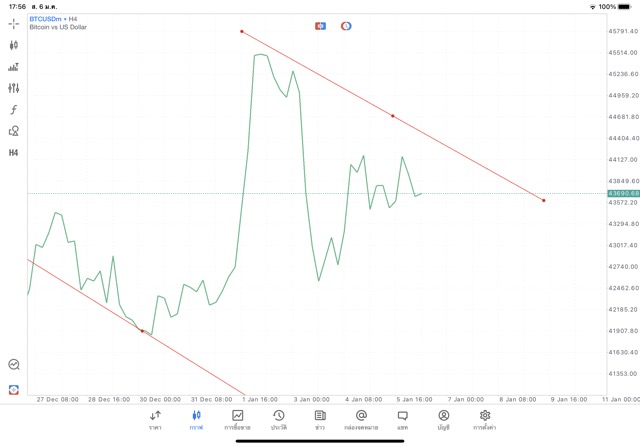 การวาด Trendline หรือ Tradeline H4 Crypto BTCUSD application Meta trader 5 หรือ mt5 โบรกเกอร์ forex exness