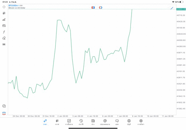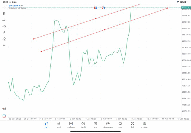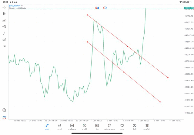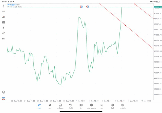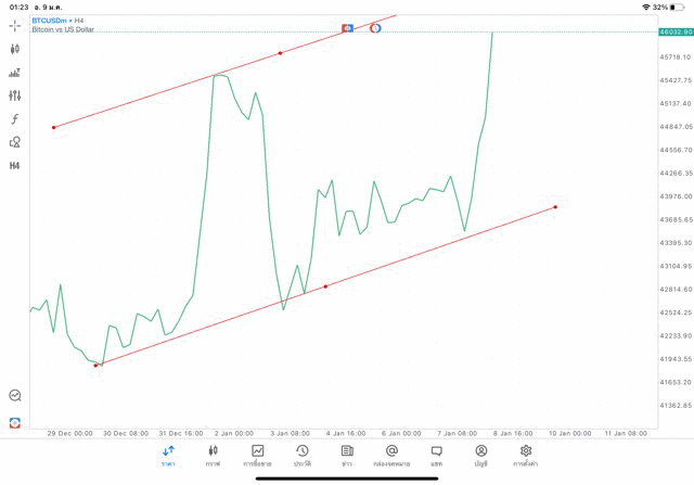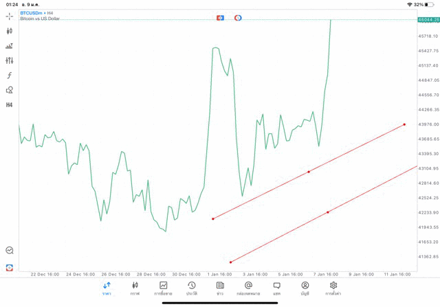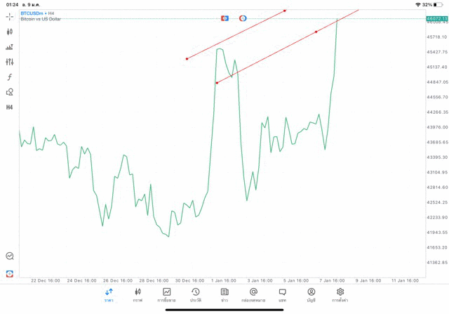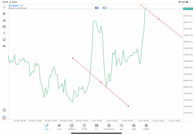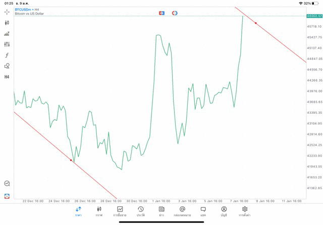 การวาด Trendline หรือ Tradeline H4 Crypto BTCUSD application Meta trader 5 หรือ mt5 โบรกเกอร์ forex exness