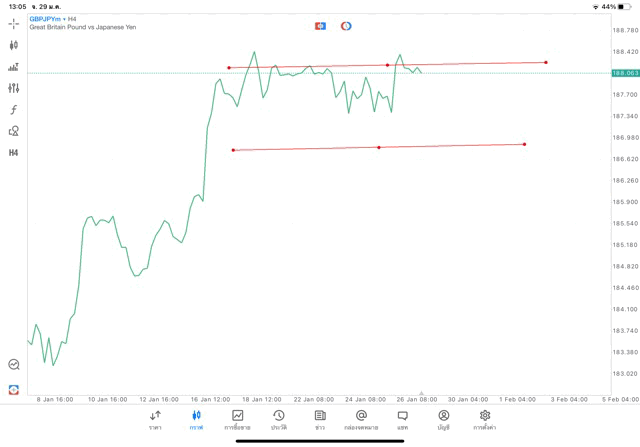 กรอบราคาและแนวทางการเคลื่อนที่ของราคา Forex GBPJPY แผนภูมิรูปแบบ กราฟ ไทม์เฟรม 4 ชั่วโมง หรือ H4 GBPJPY มาจาก Great Britain Pound vs Japanese Yen ไทม์เฟรม 4 ชั่วโมง กรอบการเคลื่อนที่ของราคาในรูปแบบต่างๆ